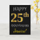 Este simples design de cartão de saudação de aniversário de casamento personalizado apresenta a mensagem "FELIZ 25º ANIVERSÁRIO DE CASAMENTO", com o "25º" tendo uma aparência semelhante a ouro falso. A frente também apresenta um nome personalizado e um fundo preto. O interior apresenta uma mensagem de saudação de aniversário de casamento personalizada. Pode ser dado a um marido ou uma esposa em celebração dos vinte e cinco anos de casamento do casal. [~Z0000076]