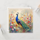 A beautiful illustration of a blue and turquoise peacock in a field of meadow of flowers. Back side of the card is blank so you can write a note.