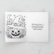A cute pink and black striped witches hat on a cute pink pumpkin with a bat background Halloween card with an inside coloring page.