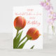 Cartão de aniversário para irmã em Direito com tulipas de primavera cor laranja e rosa e verso pensativo.