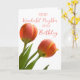 Cartão de aniversário para vizinho com tulipas primavera cor de laranja e rosa e verso pensativo.