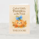 Celebre o primeiro Dia de Ação de Graças de um bebê com este adorável e personalizado cartão de vigilância! A design apresenta uma abóbora sorridente com um arco azul macio, aninhado entre folhas e bolotas dispersas do outono. O "Pumpkin Pequeno Mais Cortado no Patch" aparece acima do trabalho de arte em tons castanhos quentes, com espaço na parte inferior para um nome personalizável. Acentos azuis sutis amarram tudo juntos. Esta é uma maneira séria de marcar um marco especial e compartilhar a alegria da estação.
