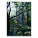 Brilhantes raios brancos do sol matinal, que passam por trás de galhos escuros para uma rica floresta verde de verão, com árvores maciças cobertas de mariposa e mato fértil.