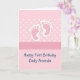 Primeiro cartão de aniversário com uma imagem querido de pegadas de bebê cor-de-rosa com bolinhas brancas em um fundo cor-de-rosa atrás da ilustração. Dentro de mensagem que você pode alterar / personalizar.