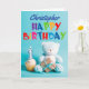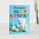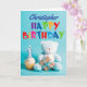 Um cartão de primeiro aniversario especial! Este primeiro cartão de aniversário apresenta um ursinho bonito, um cupcake e um texto colorido. Um design memorável para alguém que terá um ano de idade. Adicione o nome da criança do primeiro aniversario à frente da placa para personalizá-lo para o garoto ou garota especial. Em seguida, mude a dentro de mensagem para personalizá-la.