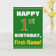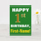 Este simples design de cartão de saudação com tema de aniversário apresenta um desejo de aniversário quente como "primeiro aniversario FELIZ, Primeiro Nome!" na frente, em texto a negrito sobre fundo de cor verde. O número de aniversário tem uma aparência falsa e imitada de cor dourada. O nome na frente pode ser personalizado. O dentro apresenta uma mensagem de aniversário personalizável. Um cartão de boas-vindas como este poderia ser uma maneira divertida de fazer votos de aniversário a alguém que comemora seu primeiro aniversário. [~Z0000279]