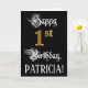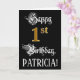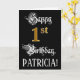 A frente deste elegante e luxuoso design de cartões de saudação de aniversário apresenta a mensagem "primeiro aniversario Feliz", e um nome de destinatário personalizado. Parte da mensagem está em um texto estilo script de rico, o grande número "1rua" tem um padrão de aparência falsa/imitado de inspiração dourada, e o fundo é preto colorido. O dentro tem uma mensagem de saudação de aniversário personalizável, ou talvez pudesse ser apagado e deixado o vazio se uma mensagem fosse escrita manualmente. Um cartão de cumprimentos de aniversário formal e personalizado como este pode ser uma maneira respeitável de enviar alguns desejos de aniversário a alguém que está celebrando seu primeiro aniversário. [~Z0000559]