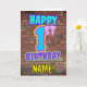 A frente deste design de carta de saudação de aniversário divertida apresenta a mensagem "PRIMEIRO ANIVERSARIO FELIZ", tendo um olhar vibrante, colorido, grafite e arte urbana de rua inspirada, além de um nome de destinatário personalizado. O fundo da frente apresenta um padrão inspirado na parede do tijolo. O dentro tem uma mensagem de saudação de aniversário personalizada, ou talvez possa ser apagado e deixado vazio se uma mensagem for escrita manualmente. Um cartão de saudação de aniversário divertido e personalizado como este pode ser uma maneira divertida de enviar uma mensagem de saudação de aniversário a alguém que está celebrando seu primeiro aniversário. [~Z0000531]