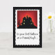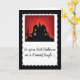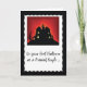 Este cartão preto, vermelho e branco, é aquele que você precisa enviar uma mensagem engraçada e celebrar seu Primeiro Halloween como um Casal casado. Esta assustadora Casa Assombrada em cima de uma colina é perfeita para a ocasião.