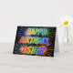 Este design de saudação de aniversário divertida, vibrante e multicolorido apresenta a mensagem "FELIZ ANIVERSÁRIO" e o nome comum "ASHER" com as letras que têm um espectro colorido do arco-íris como um padrão de colorir gradiente. O fundo da frente também apresenta um padrão colorido inspirado pela aparência de fogos de artifício comemorativos em explosão. O dentro apresenta uma mensagem de saudação personalizada, ou talvez possa ser apagado e deixado o vazio se uma mensagem for escrita manualmente. Um cartão de cumprimentos de aniversário como este poderia ser divertido de dar a alguém chamado Asher no seu aniversário. [~Z0000350]