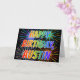 Este vibrante, multicolorido e divertido design de saudação de aniversário apresenta a mensagem "HAPPY BIRTHDAY" e o nome comum "AUSTIN" com as letras que têm um espectro colorido do arco-íris como um padrão de colorir gradiente. O fundo da frente também apresenta um padrão colorido inspirado pela aparência de fogos de artifício comemorativos em explosão. O dentro apresenta uma mensagem de saudação personalizada, ou talvez possa ser apagado e deixado o vazio se uma mensagem for escrita manualmente. Um cartão de cumprimentos de aniversário como este pode ser uma maneira divertida de enviar uma mensagem de saudação de aniversário personalizável a alguém chamado Austin. [~Z0000350]