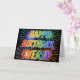 Este design de cartão de aniversário multicolorido e divertido apresenta a mensagem "FELIZ ANIVERSÁRIO", e o nome comum "EVERLY" com as letras tendo um padrão de coloração gradiente como um espectro de arco-íris colorido. O fundo da frente também apresenta um padrão colorido inspirado em fogos de artifício explosivos. O interior apresenta uma mensagem de saudação personalizada, ou talvez possa ser limpo e deixado em branco se uma mensagem for escrita à mão. Um cartão de aniversário como este pode ser uma maneira divertida de celebrar o aniversário de alguém chamado Everly. [~Z0000350]