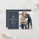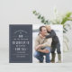 Este design de fotos moderno apresenta um layout tipográfico simples e limpo contra um fundo azul denim escuro.