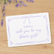 Pergunte a sua florzinha da forma mais doce possível com este charmoso e personalizável cartão "Will You Be My Flower Girl?". Apresentando um design roxo simples, mas elegante, com delicados sotaques florais e um arco, este cartão é perfeito para o fazer que ela sente especial. Personalize com o nome dela para um toque pessoal. Ideal para noivas querendo adicionar um momento corajoso aos seus preparativos de casamento. Que esta carta adorável seja uma parte memorável da sua viagem de casamento!