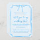 Convide os seus amigos para fazerem parte do vosso dia especial com o nosso charmoso cartão proposto pela dama de honra "Algo Azul". Este design encantador combina tradição com uma reviravolta moderna, apresentando uma fronteira azul-chic e um roteiro caprichoso que pergunta, "Será que você será meu algo azul?" Perfeito para definir o tom de um casamento que é tão único quanto sua amizade, este cartão permite personalizar o texto para tornar seu convite realmente pessoal. Celebre sua jornada de casamento com um pedaço de azul!