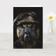Retrato do cão de filhote de cachorro do pug do motociclista de Badass. É refletida em seus olhos a cara de um gato scared do gatinho. O boné do motociclista de couro preto não diz "nenhum Katz".