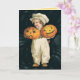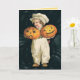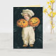 O adorável vintage está segurando duas abóboras de Halloween entaladas. Um é feliz e outro é triste. O texto dos bombeiros diz saudações de Halloween.