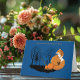 Um boi vermelho senta ao lado de abóboras e folhas de outono. Algumas folhas do outono estão voando em direção à floresta atrás da raposa vermelha.