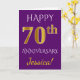 This simple, personalized wedding anniversary greeting card design features the message "HAPPY 70th ANNIVERSARY", with the "70th" having a faux gold-like appearance. The front also features a personalized name, and a purple colored background. The inside features a personalized wedding anniversary greeting message. It could be given to a husband or a wife in celebration of the couple’s seventieth wedding anniversary. [~Z0000089]