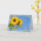 Um cartão de saudação elegante com uma foto de dois lindos girassóis no verão, perfilado contra o fundo de um céu azul claro. Com um quadro na moda, ouro clássico.