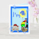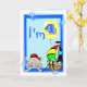 4.º cartão de aniversário com pirata e nave engraçada, palhaço, pinguim e balões, num fundo azul. Personalize facilmente este design, adicionando ou alterando o texto.