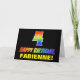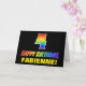 A frente deste design de cartão de saudação animado, divertido e colorido com tema de aniversário apresenta um grande número "4" e a mensagem "FELIZ BIRTHDAY", ambos tendo um gradiente de padrão inspirado no espectro do arco-íris, juntamente com um nome de destinatário ousado amarelo editável. A frente também tem um simples fundo preto. O dentro tem uma mensagem de saudação de aniversário personalizada, ou talvez possa ser apagado e deixado vazio se uma mensagem for escrita manualmente. Um cartão de aniversário personalizável e alegre como este pode ser uma maneira divertida de enviar uma mensagem celebrando o quarto aniversário de alguém. [~Z0000472]