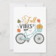 A design "Fall Vibes" é uma ilustração encantadora e caprichosa que captura perfeitamente a essência do outono. O elemento central do design é uma bicicleta ao estilo vintage, reproduzida numa cor azul macia e pastel. A bicicleta tem um olhar clássico e retrô com guiões curvos e uma cesta conectada à frente.