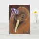 Um Quivi da Nova Zelândia vestindo um chapéu de festa listrado de roxo e branco. Cartão de cumprimentos de arte de ave personalizável. Ótimo para todas as ocasiões, incluindo aniversários. Personalize a mensagem interna ou exclua-a. Criado a partir de uma pintura original © 2010 Lisa Marie Robinson