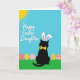 This design shows a stylized black cat in silhouette, seen from behind as if pausing to watch a sweet little scene unfold. The cat wears tall rabbit ears outlined in white with pink accents and a sunny yellow bow tie, giving it a friendly, affectionate look 🐰. In front of the cat, five decorated eggs sit in a row on bright green grass, like a small parade meant to be admired together. The eggs feature coral and warm yellow patterns such as dots and zigzags, and their close spacing suggests a cozy, companionable moment. In the upper left, a golden sun with simple rays adds warmth to the open, clear blue sky. Across the sky, the words “Happy Easter Daughter” appear in flowing white lettering, floating above the scene rather than sitting in a border. The sky stays uncluttered, with the sun glowing near the top left and the white message centered across the blue 🌷.