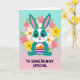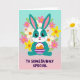 Designed with a sweet, stylized rabbit at the center, this card features a teal body with a white blaze on the face and a white belly, giving it a gentle, friendly look 🐰. The rabbit’s big eyes, tiny heart-shaped nose, and rosy cheeks suggest a tender, affectionate mood, as if it’s shyly offering a gift to someone special. Long ears with pink inner details stand upright, adding to the attentive pose. In its paws, it holds a small basket with purple-and-white stripes, filled with smooth orange egg shapes that feel like a shared springtime find 🐇. A ring of flowers frames the character, mixing pastel pink, sunny yellow, and soft white petals with orange centers, threaded with light green leaves. Behind everything, the background fades in a vertical gradient from aqua at the top to blush pink near the bottom, keeping the scene airy and soft. Near the lower portion, friendly purple text is placed prominently, standing out clearly against the lighter backdrop. The floral wreath circles the rabbit evenly, with blossoms and leaves spaced all around like a gentle halo.