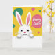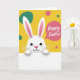 This card features a white, human-like rabbit leaning over a white horizontal ledge, as if it’s shyly greeting someone special 🐰. Its long ears have rosy pink inner details, and a small pink nose sits above a gentle smile that suggests friendly affection. Glossy black eyes and fine white whiskers add to the tender, attentive look, like it’s waiting for a warm reply. The background is a sunny yellow field that feels bright and inviting, with soft-edged abstract shapes scattered in deep green and rich pink for contrast. On the right side, a pink speech bubble holds the words “Happy Easter” in dark lettering, centered neatly inside the bubble. The rabbit’s small rounded paws rest on the ledge, gripping the edge as though it’s peeking up to share a quiet moment 🌷. Behind it all, the yellow backdrop is dotted with rounded green and pink shapes that float around the speech bubble.