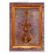 Um a lápis desenho de um violino compreendido de flourishes e de rolos do ornamental pendura em um quadro de madeira cinzelado em um fundo de madeira pintado