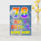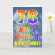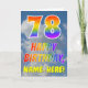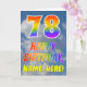 This fun and colorful 78th birthday greeting card design features a representation of a blue sky with clouds, along with a large number "78" and the message "HAPPY BIRTHDAY," having a rainbow spectrum inspired gradient pattern coloring, on the front. The front also features a customized recipient name. The inside features a customizable birthday greeting message, or could perhaps be cleared and left blank if a message is to be written by hand instead. A customizable birthday card like this might be a fun way to send a message in celebration of somebody’s seventy eighth birthday. [~Z0000371]