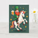 Designed with a festive, storybook look, the card shows a smiling leprechaun riding a rearing white unicorn at the center of the scene. He wears emerald green clothes and a tall green hat, his orange beard framing a grin as he lifts a frothy pint like a toast shared with a close friend 💚. The unicorn’s bright blue eyes and golden spiral horn catch the light, while its rainbow mane and tail sweep upward in flowing strands 🌈. Behind them, a deep teal-green backdrop is sprinkled with small golden shamrocks and soft, pale green stars, like confetti floating in night air. The leprechaun leans forward with an easy confidence, and the unicorn’s lifted front legs add a lively, celebratory energy to their partnership. A St. Patrick’s Day greeting sits near the top in light gold lettering, with smaller words tucked beneath in pale green for contrast. Golden shamrocks dot the corners, and the rainbow mane arcs across the right side while the unicorn’s tail curls along the lower edge.