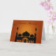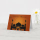 Cartão Ramadã com mesquita e lua crescente com estrela contra fundo de ouro e laranja com padrão.
