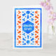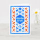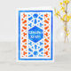 A Ramadhan Greeting card with a traditional Islamic Lattice pattern in white on a blue and orange background. The text in the central pane; is in white and reads, 'Ramadhan Kareem'. Design handpainted in watercolors by Judy Adamson. The inside is left blank for your own message.