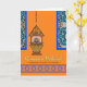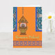 Ramadan Mubarak da minha casa para a sua. Uma lanterna fanoica está acesa e pendura de uma corrente. Coloque sobre um fundo de uma parede laranja com janelas de filigrana de ornamentado. Imagem e direitos de autor © Shoaff Ballanger Studios.