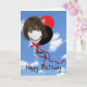 Rosto sorridente da garota com cabelo num balão de aniversário branco e fundo do céu. O plano de fundo pode ser alterado.