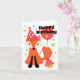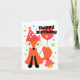 Cartão de nota com ilustração cartoon de uma pequena raposa com um cupcake e um balão vestindo um chapéu de festa. À sua volta estão estrelas de confete coloridas.