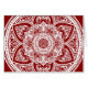 Esta mandala branca senta-se sobre um fundo vermelho escuro. A cor é profunda e quente. Parte da Coleção Bardh Mandala.