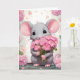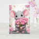 Rato cinza bonito com buquê floral rosa para aniversário. O texto pode ser alterado.