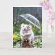 Rato branco bonito com um guarda-chuva na chuva. O texto é editável.