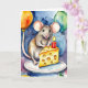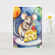 Rato bonito com uma vela de aniversário vermelha numa fatia de queijo e balões de festas. O texto dentro é editável.