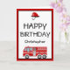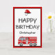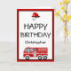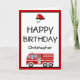Cartão de aniversário de caminhão de incêndio bonito para crianças. Este cartão de aniversário personalizado apresenta um motor de incêndio vermelho e chapéu com a idade da criança.