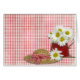 Buquê de margarida com chapéu de palha em fundo de gingham.