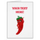 Um personagem de desenho animado de pimenta vermelho e quente. Design original com efeito de falso brilho aplicado à imagem. Cartão de saudação personalizado. Editar texto para personalização. dentro de vazio para mensagens manuscritas. Ideia para amantes de comidas picantes.