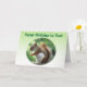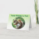 Este esquilo vermelho gordinho está desejando a alguém especial um feliz aniversário. Ela é tão fofa contra o fundo das folhas verdes.