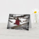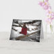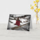 Este cartão de amizade apresenta uma jovem refletida em uma jaqueta vermelha sentada em um tronco caído em um riacho parcialmente congelado refletindo sobre a neve, a fria cena do inverno. O texto diz: Só pensando em você... Ele pode ser personalizado para atender às suas necessidades.