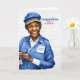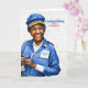 Cabelo grisalho, pele morena, funcionária postal feminina afro-americana cartão divertido para parabenizá-la pela aposentadoria do Serviço Postal adicionando seu nome à etiqueta de identificação na frente do cartão.