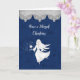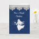 Cartão religioso de Natal em prata e azul com um anjo prateado segurando uma estrela e faíscas falsas. O topo da design tem um lugar falso e o fundo é azul real com uma dica de presentes. Obrigados para cortes de Design, armadilhas para uso comercial e malhas criativas para alguns dos elementos do design.